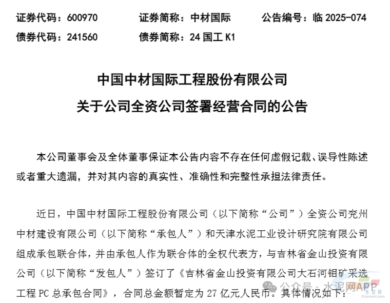公告内容显示,近日,中材国际全资公司兖州中材建设有限公司(以下简称“承包人”)和天津水泥工业设计研究院有限公司组成承包联合体,并由承包人作为联合体的全权代表方,与吉林省金山投资有限公司(以下简称“发包人”)签订了《吉林省金山投资有限公司大石河钼矿采选工程PC总承包合同》,合同总金额暂定为27亿元人民币。