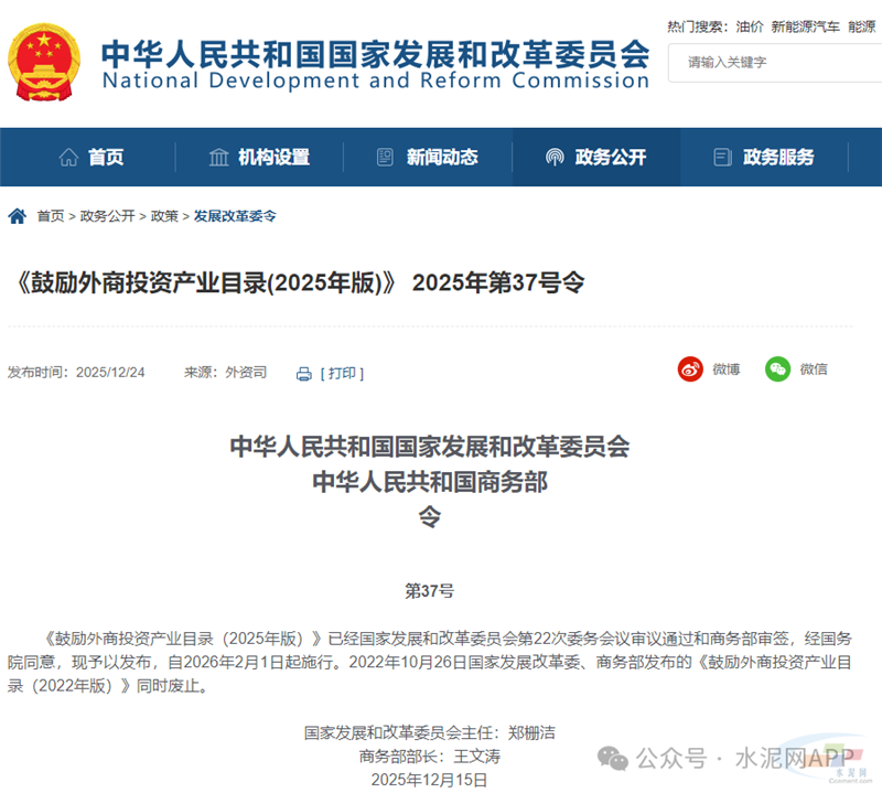 12月24日,国家发改委、商务部联合发布《鼓励外商投资产业目录(2025年版)》 2025年第37号令。 《鼓励外商投资产业目录(2025年版)》已经国家发展和改革委员会第22次委务会议审议通过和商务部审签,经国务院同意,现予以发布,自2026年2月1日起施行。2022年10月26日国家发展改革委、商务部发布的《鼓励外商投资产业目录(2022年版)》同时废止。  、在《鼓励外商投资产业目录(2025年版)》中,有6条内容与水泥行业相关,具体如下: 1.节能、环保、利废、轻质高强、高性能、多功能建筑材料的开发与生产; 2.水泥、电子玻璃、陶瓷、微孔炭砖等窑炉用长寿命节能环保(无铬化)耐火材料的生产; 3. 利用新型干法水泥窑、烧结墙体材料生产设施无害化处置固体废弃物; 4. 建筑垃圾再生利用相关业务; 5. 气化渣、工业副产石膏等产业废弃物的综合利用; 6.非金属矿山尾矿综合利用新技术的开发与应用,以及历史遗留矿山生态修复相关工作。